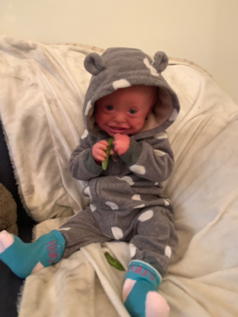 It was a hell for me because Olivia hated it even more than I did. It was exhausting because measuring and cutting and taping and fighting insurance on ordering particular adhesives created a never ending list of things I had to do TO my baby. It’s a tough thing to grapple with because the technology saved and sustained Olivia’s life. She was growing and tolerating most of her feeds. Without a feeding tube, I’m not sure how long Olivia would have stayed with us. But I also know that babies eat when they are motivated, and sometimes you have to just give them that chance to feel hungry and eat. But feeding tubes also provide an opportunity to pack in some extra calories when their bodies are too tired to do the work. And here we are, with no feeding tube and teeth coming in and an appetite that is nothing short of impressive!